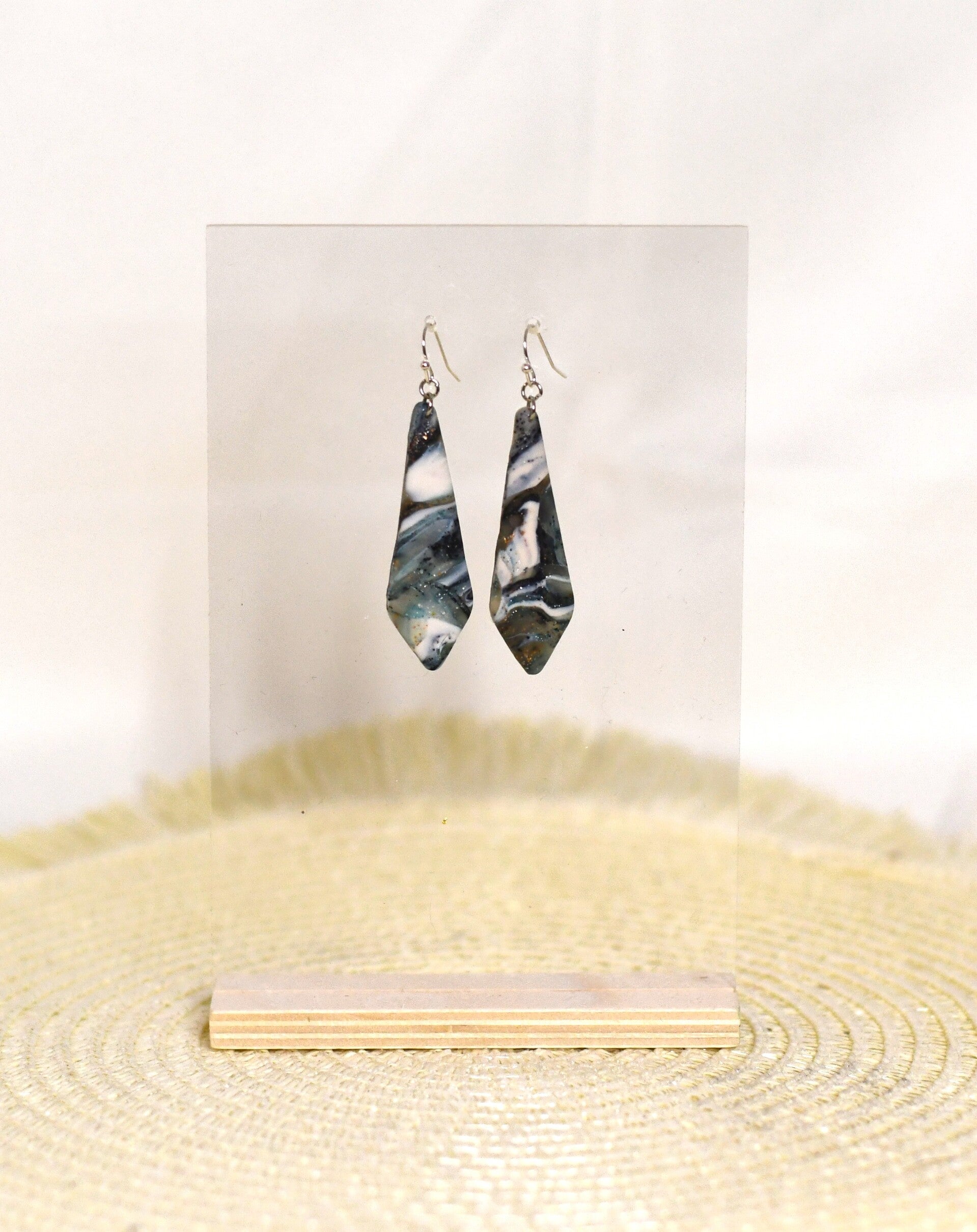 Noa is elegant minimalisme met een artistieke twist. Het marmer-effect in oceaangroen, grijs, wit en een tikje zwart geeft diepte en beweging, terwijl de zilverkleurige oorhaakjes het geheel luchtig en modern houden. Superlicht, comfortabel en meteen bijzonder — precies dat subtiele statement dat elke outfit optilt.