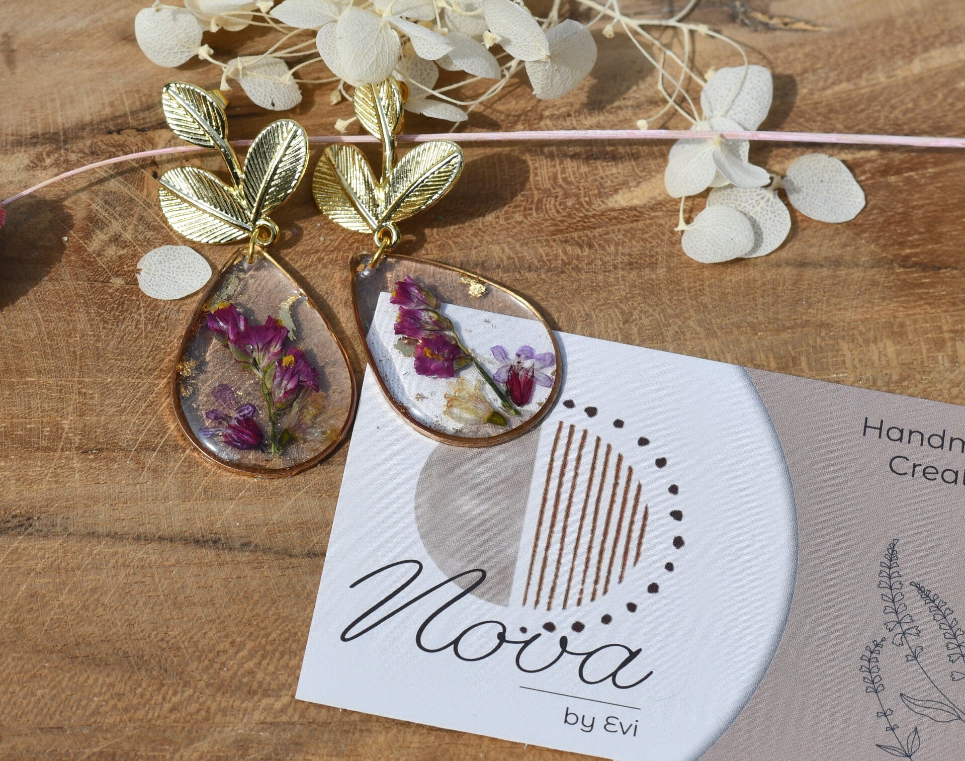 Materiaal: epoxy met gedroogde bloemen; oorhaakjes metaal (goudkleurig)