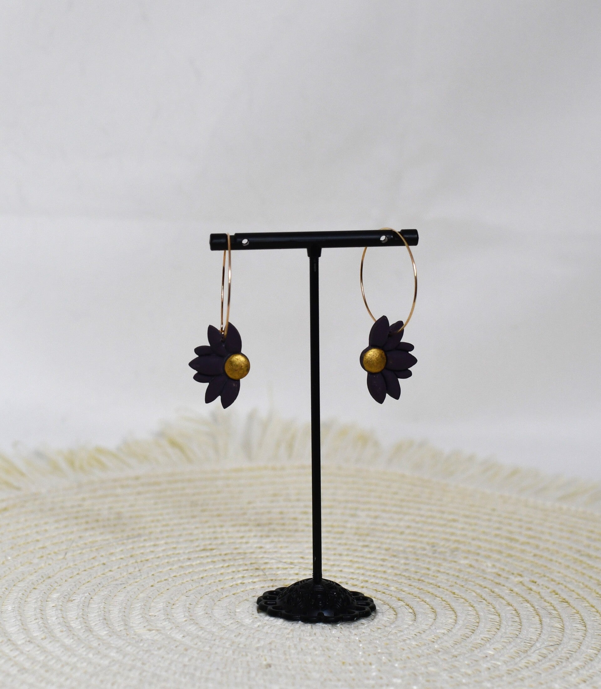 Belle is pure flower-power met een chique twist. De bloem in diep aubergine/paars is handbeschilderd met acrylverf en krijgt extra flair door het gouden hartje en de goudkleurige hoepels. Superlicht, speels in beweging en toch elegant — precies het accent dat elke look af maakt.