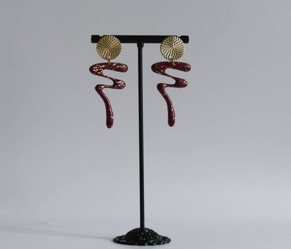 Lana zijn elegante statement oorbellen met een vloeiende vorm, diepe bordeauxtint en sprankelende gold flakes. Licht, luxe en perfect voor wie houdt van een opvallende maar verfijnde look.
